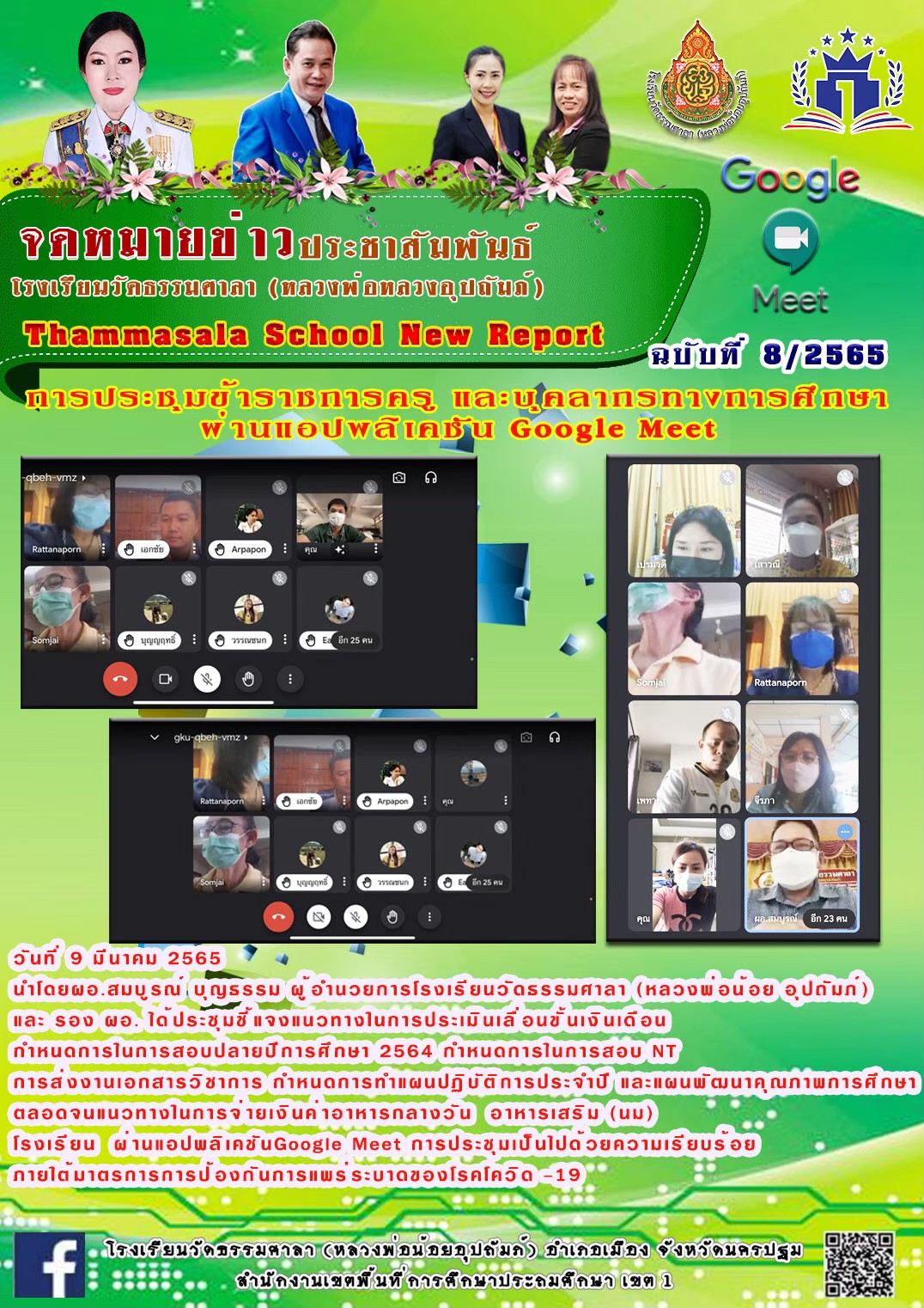 จดหมายข่าว ประชาสัมพันธ์ การประชุมครูและบุคลากรออนไลน์ ผ่านโปรแกรม Google Meet นำโดย ผอ.สมบูรณ์ บุญธรรม ผู้อำนวยการโรงเรียนวัดธรรมศาลา(หลวงพ่อน้อยอุปถัมภ์)