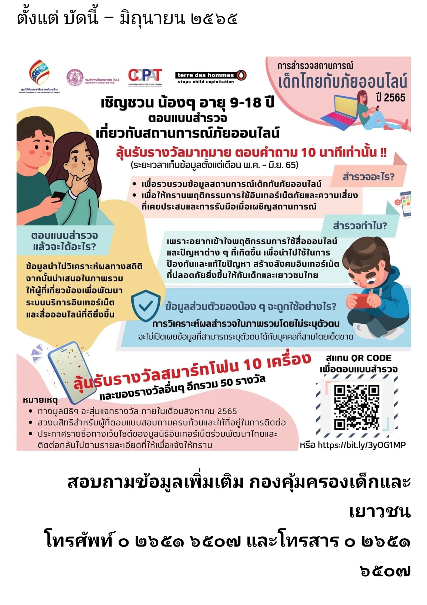 ข่าวประชาสัมพันธ์ ให้แก่เด็กนักเรียนและเยาวชน ทั่วประเทศร่วมกันตอบแบบสำรวจสถานการณ์เด็กไทยกับภัยออนไลน์ ประจำปี ๒๕๖๕ ชิงรางวัล สมาร์ทโฟน 10 เครื่อง