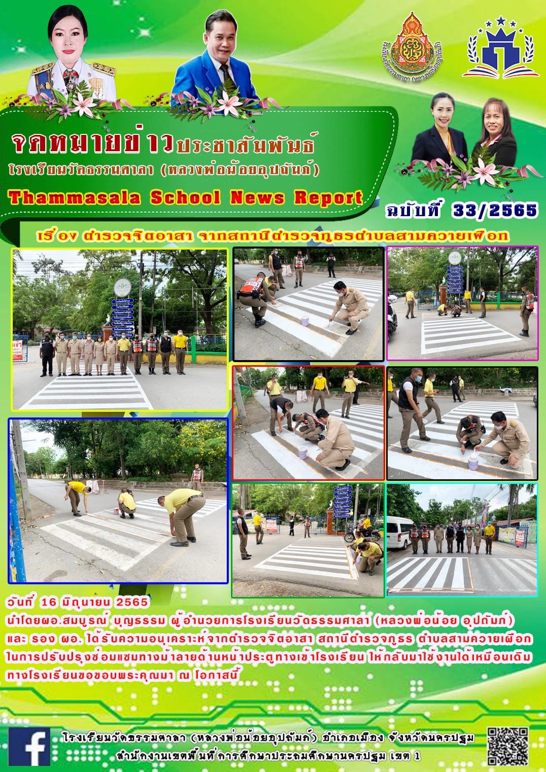 จดหมายข่าว ประชาสัมพันธ์ โรงเรียนวัดธรรมศาลา(หลวงพ่อน้อยอุปถัมภ์) ได้รับความอนุเคราะห์จากตำรวจจิตอาสา สถานีตำรวจภูธรตำบลสามควายเผือก ในการปรับปรุงซ่อมแซมทางม้าลายบริเวณถนนหน้าโรงเรียน