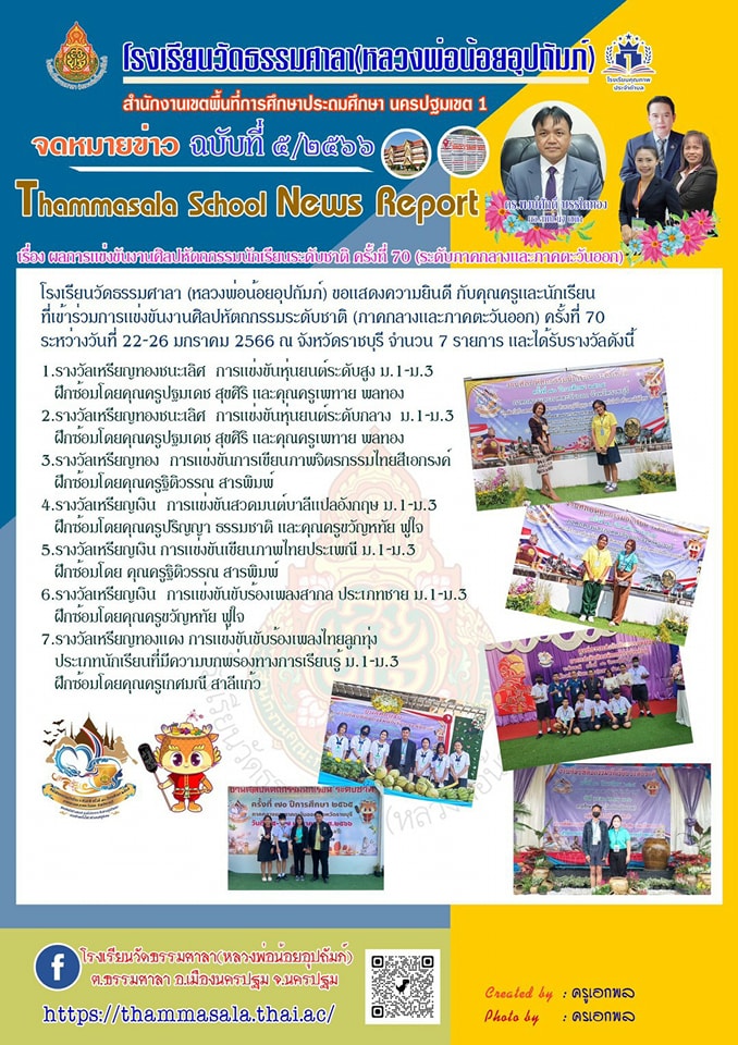 จดหมายข่าว ประชาสัมพันธ์ โรงเรียนวัดธรรมศาลา(หลวงพ่อน้อยอุปถัมภ์) เรื่องผลการแข่งขันงานศิลปหัตถกรรมนักเรียนระดับชาติ ครั้งที่ 70 (ระดับภาคกลางและภาคตะวันออก)