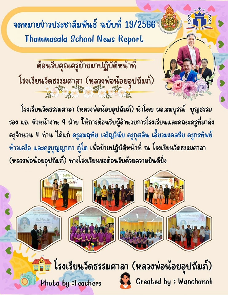 จดหมายข่าว ประชาสัมพันธ์ โรงเรียนวัดธรรมศาลา(หลวงพ่อน้อยอุปถัมภ์) เรื่องยินดีต้อนรับครูย้ายมาปฏิบัติหน้าที่ ณ โรงเรียนวัดธรรมศาลา(หลวงพ่อน้อยอุปถัมภ์)