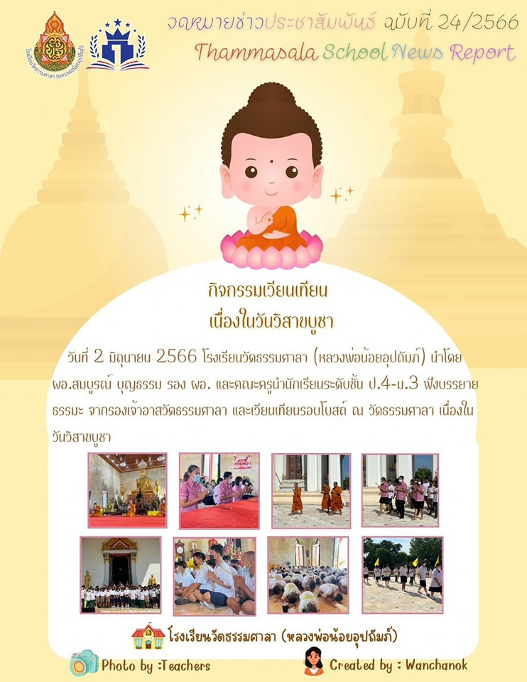 จดหมายข่าว ประชาสัมพันธ์ โรงเรียนวัดธรรมศาลา(หลวงพ่อน้อยอุปถัมภ์) เรื่องกิจกรรมเวียนเทียนเนื่องในวันวิสาขบูชา