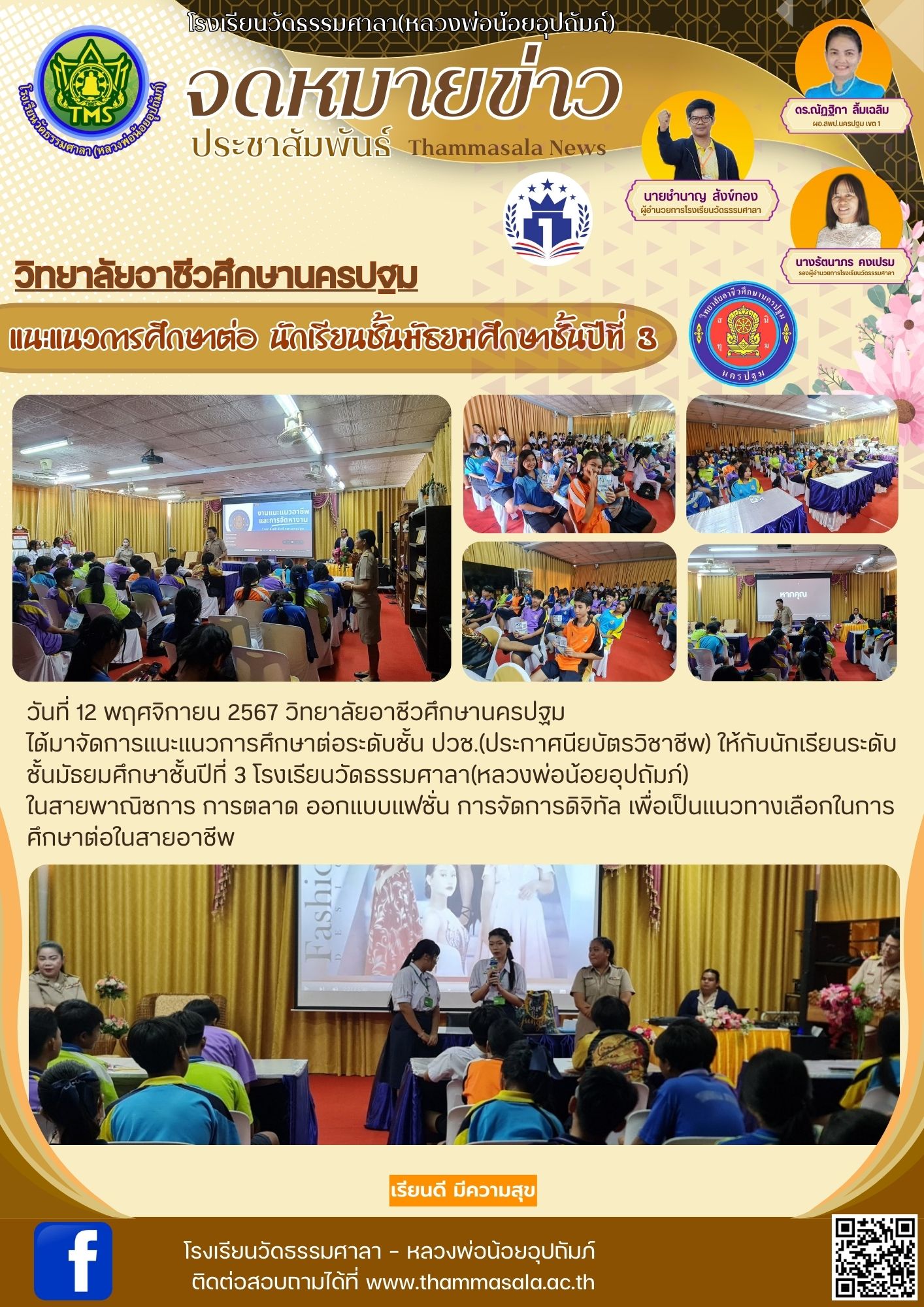จดหมายข่าว ประชาสัมพันธ์ โรงเรียนวัดธรรมศาลา(หลวงพ่อน้อยอุปถัมภ์) วันที่ 12 พฤศจิกายน 2567 วิทยาลัยอาชีวนครปฐม ได้มาจัดการแนะแนวการศึกษาต่อระดับชั้น ปวช.(ประกาศนียบัตรวิชาชีพ) ให้กับนักเรียนระดับชั้นม
