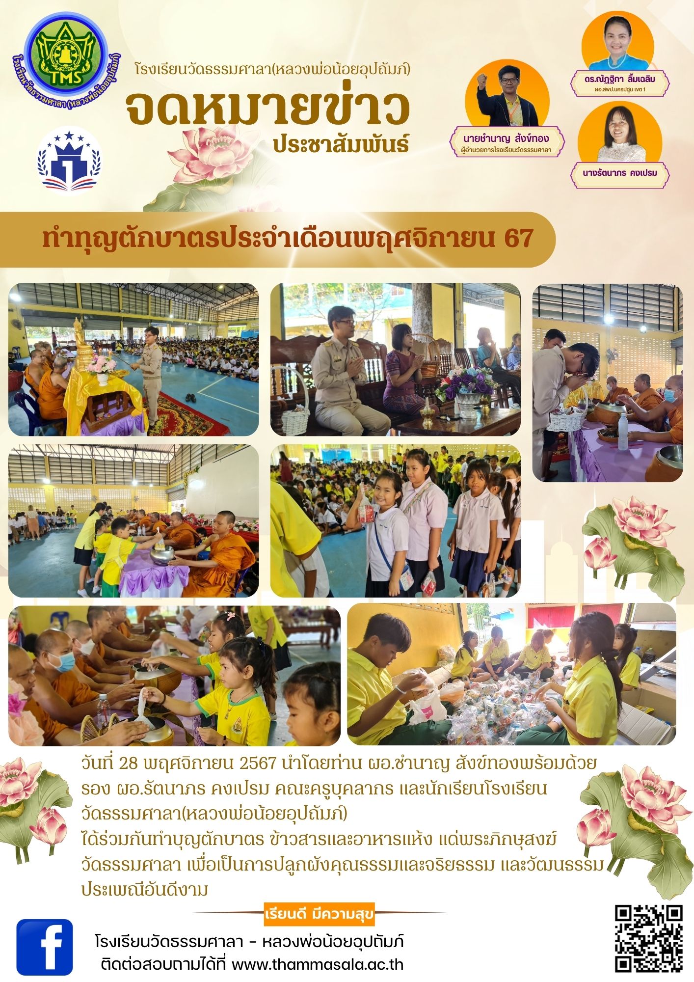 จดหมายข่าวประชาสัมพันธ์ โรงเรียนวัดธรรมศาลา(หลวงพ่อน้อยอุปถัมภ์) ทำบุญใส่บาตร ข้าวสารอาหารแห้ง ประจำเดือนพฤศจิกายน 2567