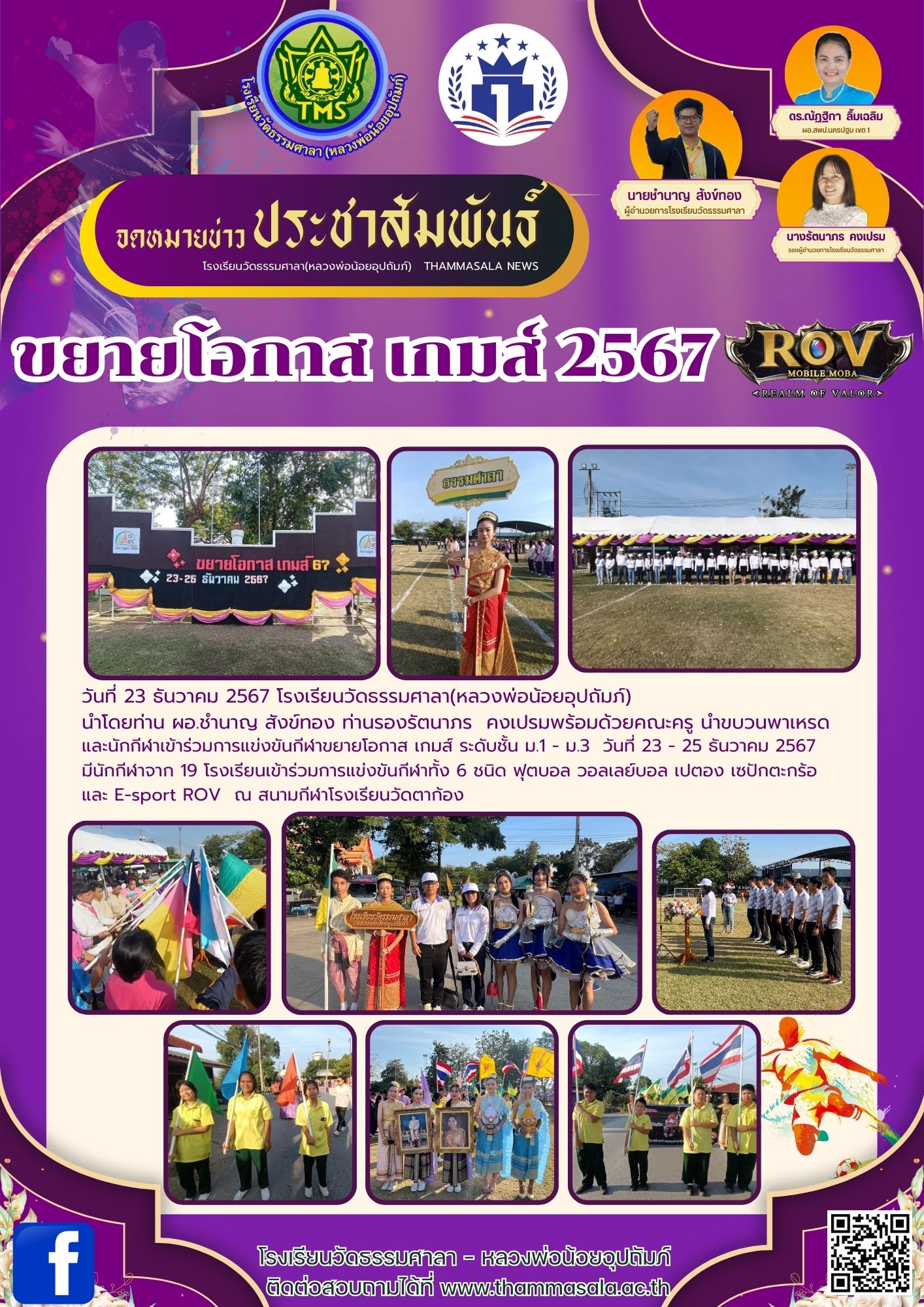 จดหมายข่าว ประชาสัมพันธ์ วันที่ 23 ธันวาคม 2567 โรงเรียนวัดธรรมศาลา(หลวงพ่อน้อยอุปถัมภ์)นำโดยท่าน ผอ.ชำนาญ สังข์ทอง ท่านรองรัตนาภร คงเปรมพร้อมด้วยคณะครู นำขบวนพาเหรด และนักกีฬาเข้าร่วมการแข่งขันกีฬาข