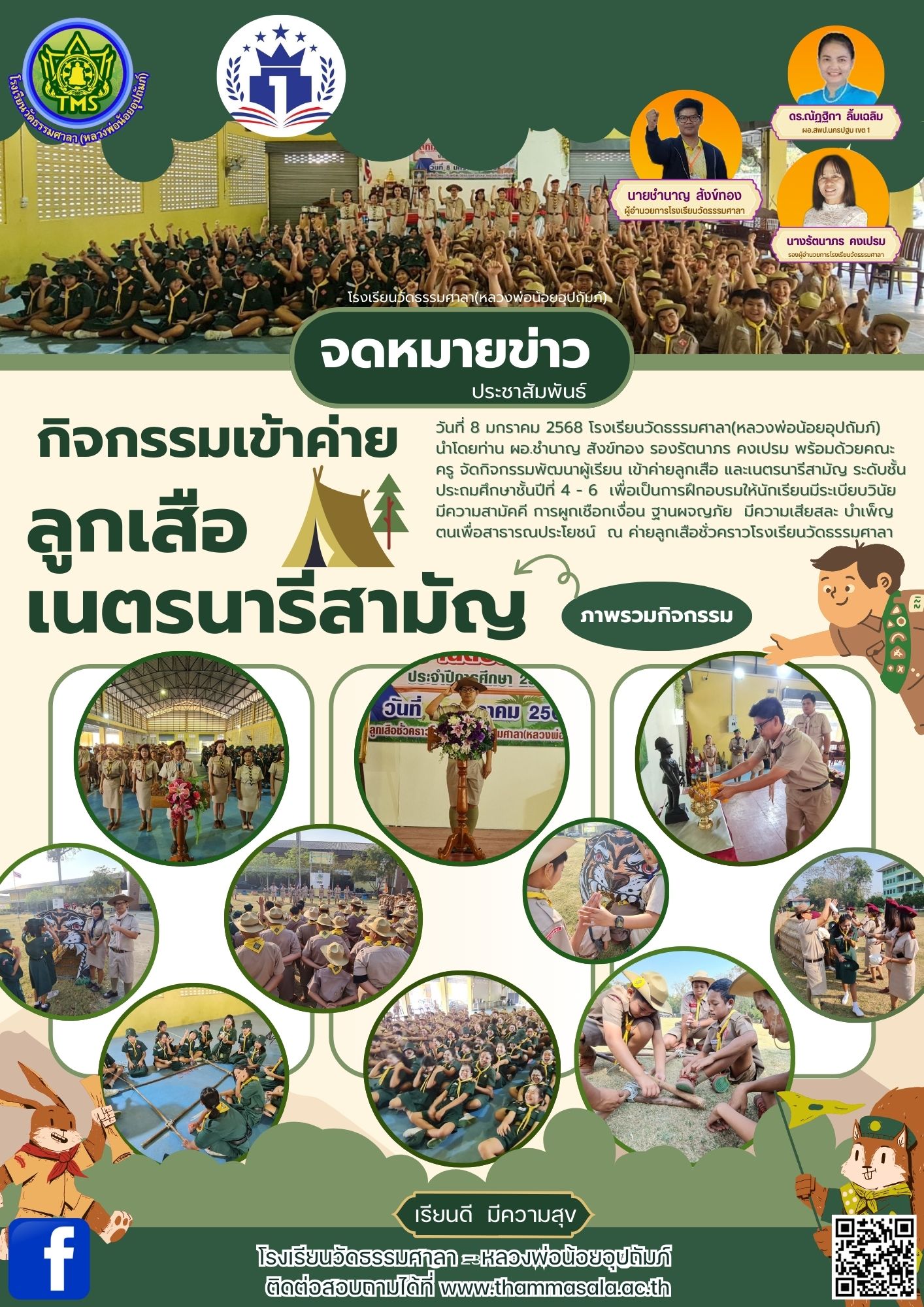 จดหมายข่าว ประชาสัมพันธ์ วันที่ 8 มกราคม 2568 โรงเรียนวัดธรรมศาลา(หลวงพ่อน้อยอุปถัมภ์)นำโดยท่าน ผอ.ชำนาญ สังข์ทอง รองรัตนาภร คงเปรมพร้อมด้วยคณะครู จัดกิจกรรมพัฒนาผู้เรียน เข้าค่ายลูกเสือ เนตรนารีสามั