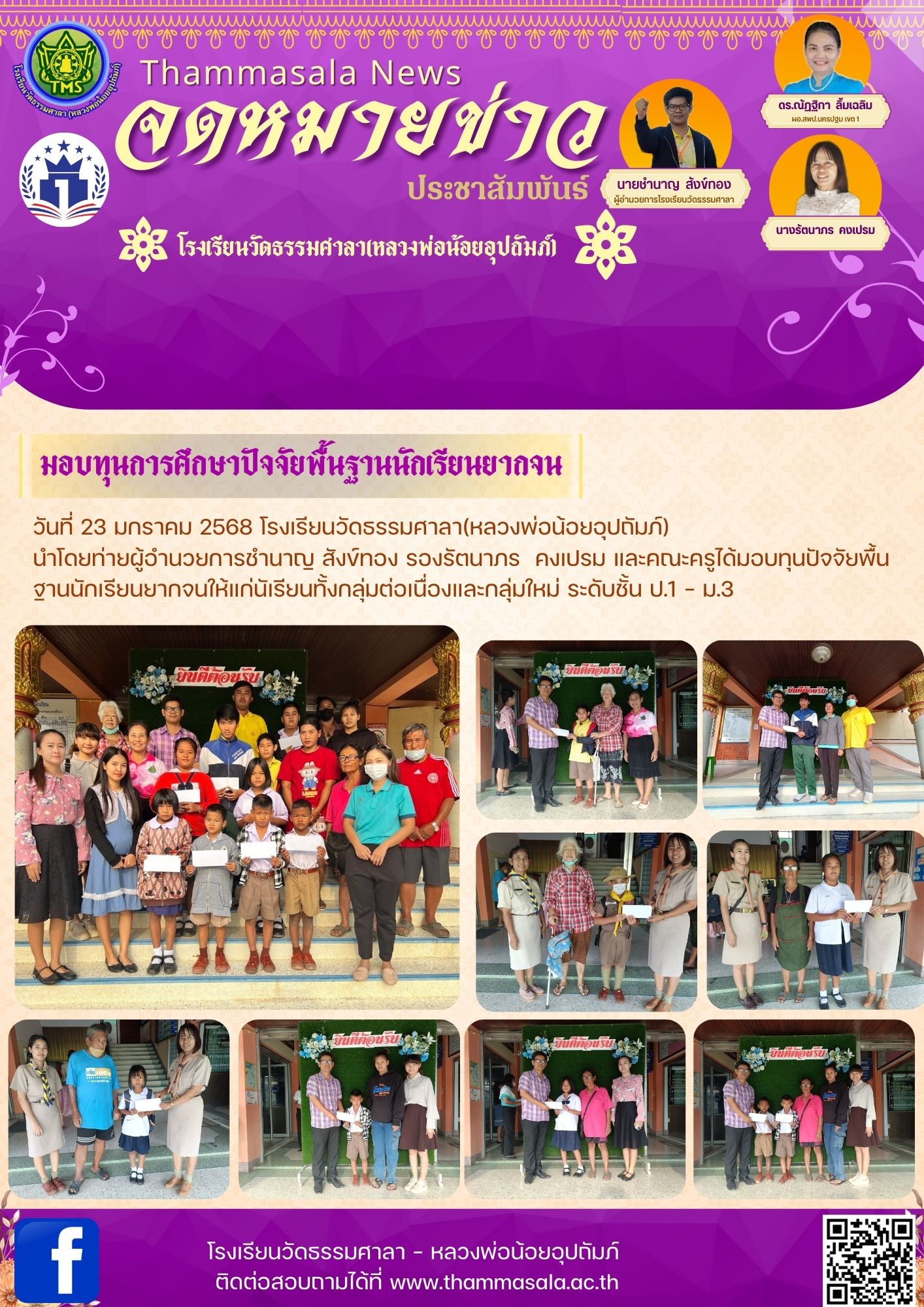 จดหมายข่าว ประชาสัมพันธ์ วันที่ 23 มกราคม 2568 โรงเรียนวัดธรรมศาลา(หลวงพ่อน้อยอุปถัมภ์)มอบทุนปัจจัยพื้นฐานนักเรียนยากจนให้แก่นักเรียน ระดับชั้น ป.1-ม.3