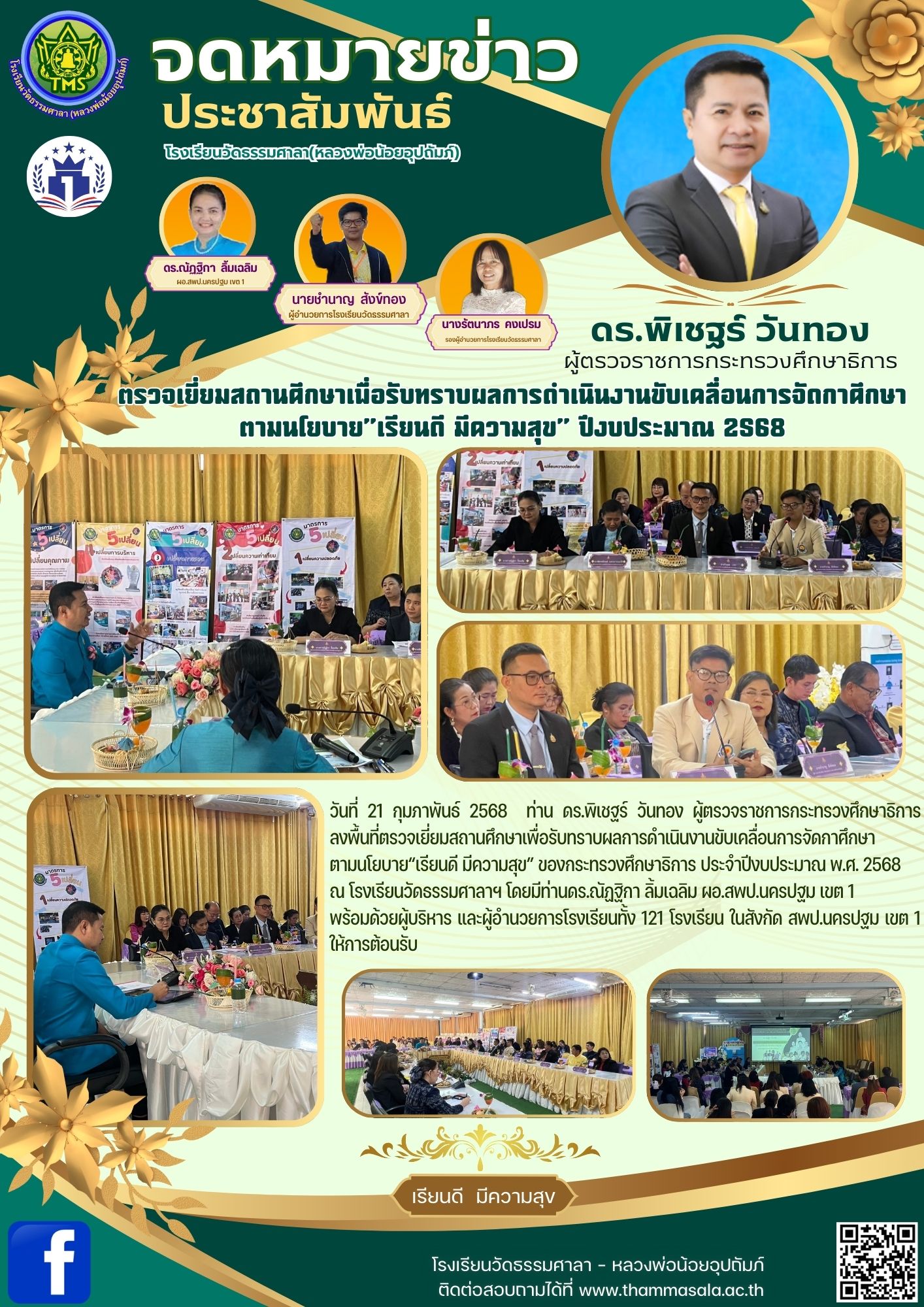 จดหมายข่าว ประชาสัมพันธ์ โรงเรียนวัดธรรมศาลา(หลวงพ่อน้อยอุปถัมภ์) วันที่ 21 กุมภาพันธ์ 2568 ท่าน ดร.พิเชฐร์ วันทอง ผู้ตรวจราชการกระทรวงศึกษาธิการ ลงพื้นที่ตรวจเยี่ยมสถานศึกษาเพื่อรับทราบผลการดำเนินงา