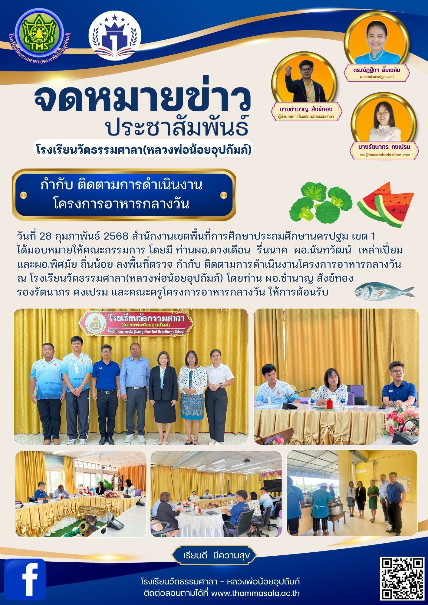 วันที่ 28 กุมภาพันธ์ 2568 สำนักงานเขตพื้นที่การศึกษาประถมศึกษานครปฐม เขต 1 ได้มอบหมายให้คณะกรรมการ ลงพื้นที่ตรวจ กำกับ ติดตามการดำเนินงานโครงการอาหารกลางวัน ณ โรงเรียนวัดธรรมศาลา(หลวงพ่อน้อยอุปถัมภ์)
