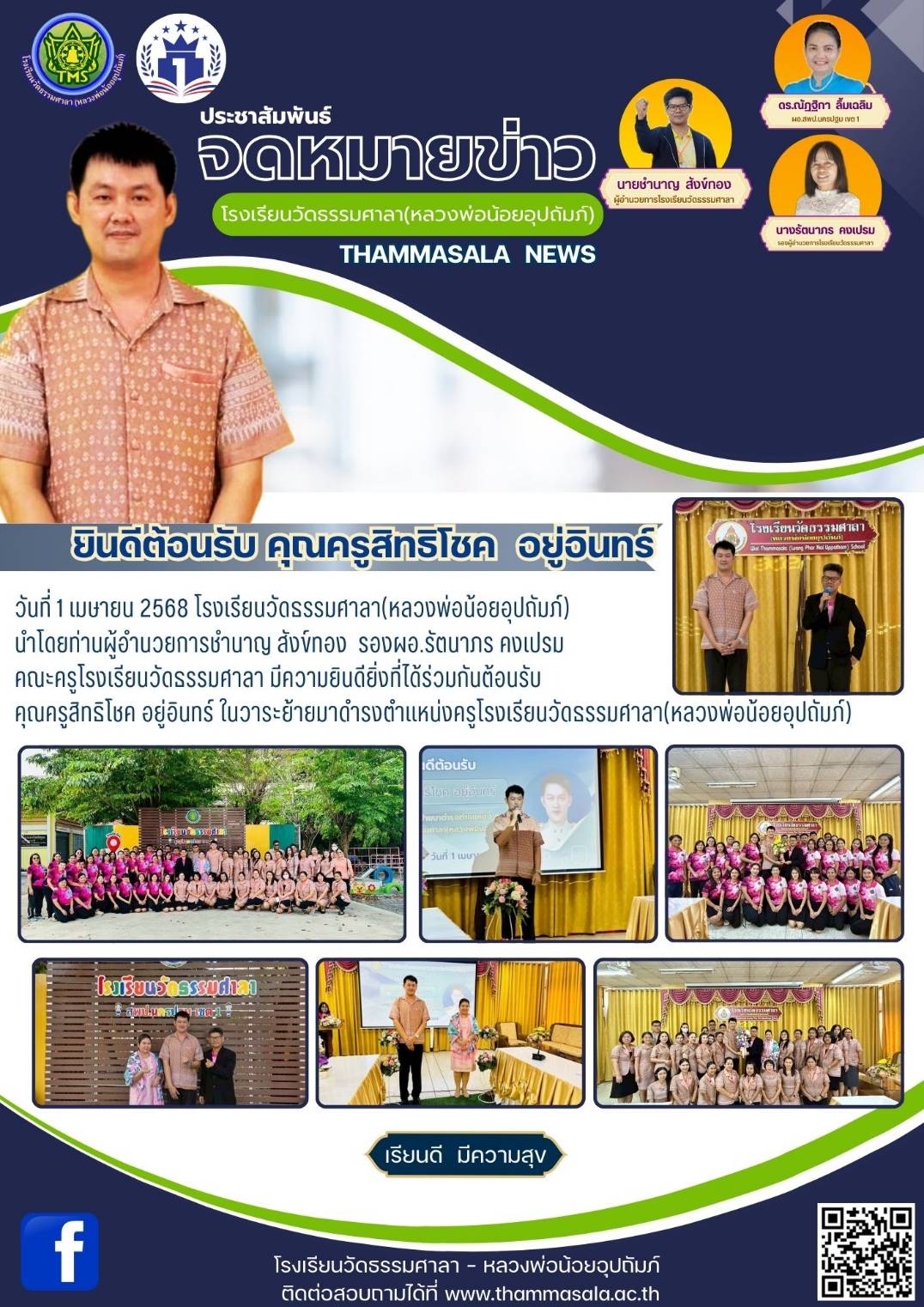 วันที่ 1 เมษายน 2568 โรงเรียนวัดธรรมศาลา(หลวงพ่อน้อยอุปถัมภ์) นำโดยท่าน ผอ.ชำนาญ สังข์ทอง รองผอ.รัตนาภร คงเปรม และคณะครู ร่วมกันต้อนรับ คุณครูสิทธิโชค อยู่อินทร์ ในการย้ายมาดำรงตำแหน่งครูโรงเรียนวั
