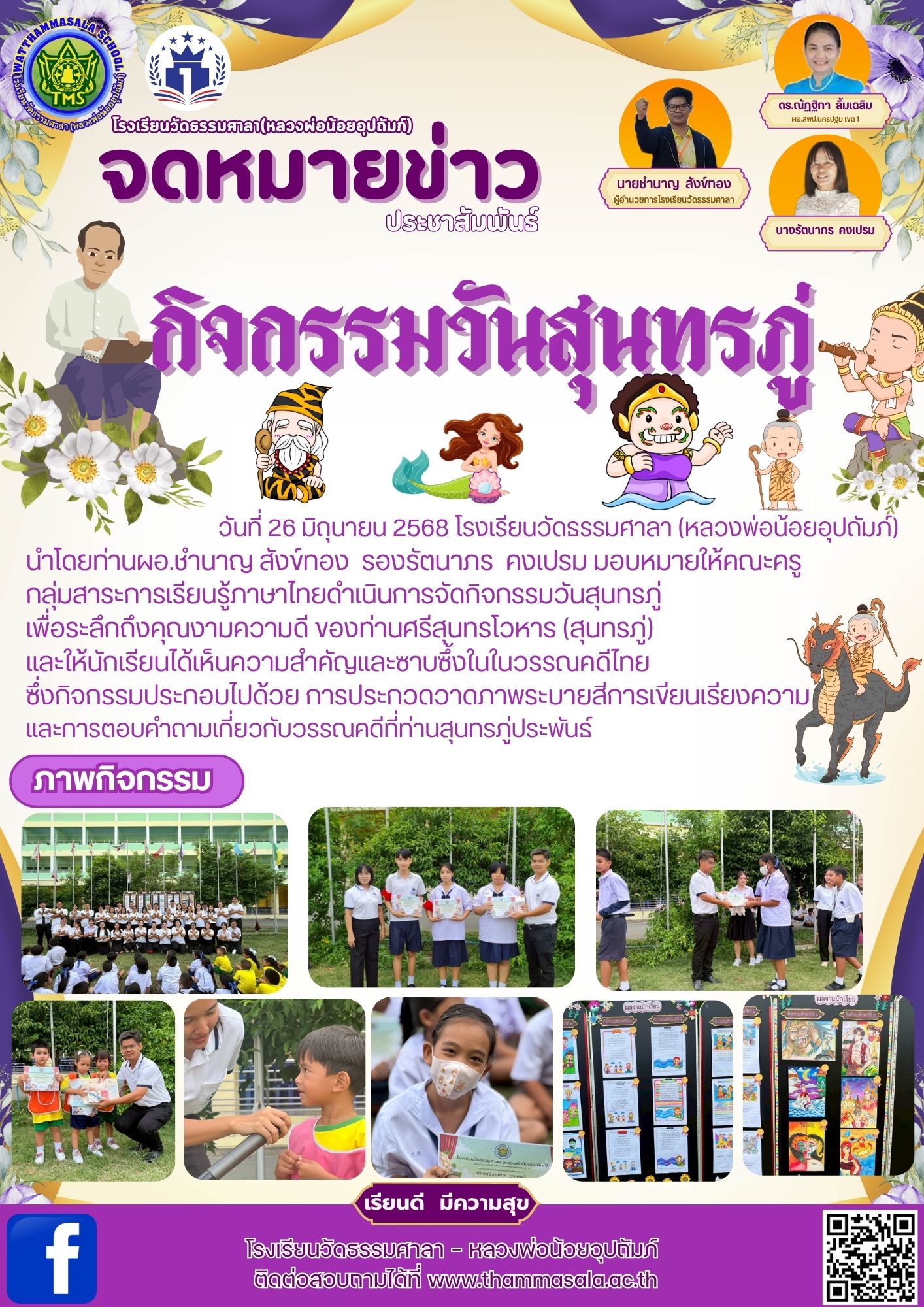 จดหมายข่าวประชาสัมพันธ์ วันที่ 26 มิถุนายน 2568 โรงเรียนวัดธรรมศาลา (หลวงพ่อน้อยอุปถัมภ์)นำโดยท่านผอ.ชำนาญ สังข์ทอง รองรัตนาภร คงเปรม มอบหมายให้คณะครูกลุ่มสาระการเรียนรู้ภาษาไทยดำเนินการจัดกิจกรรมวั