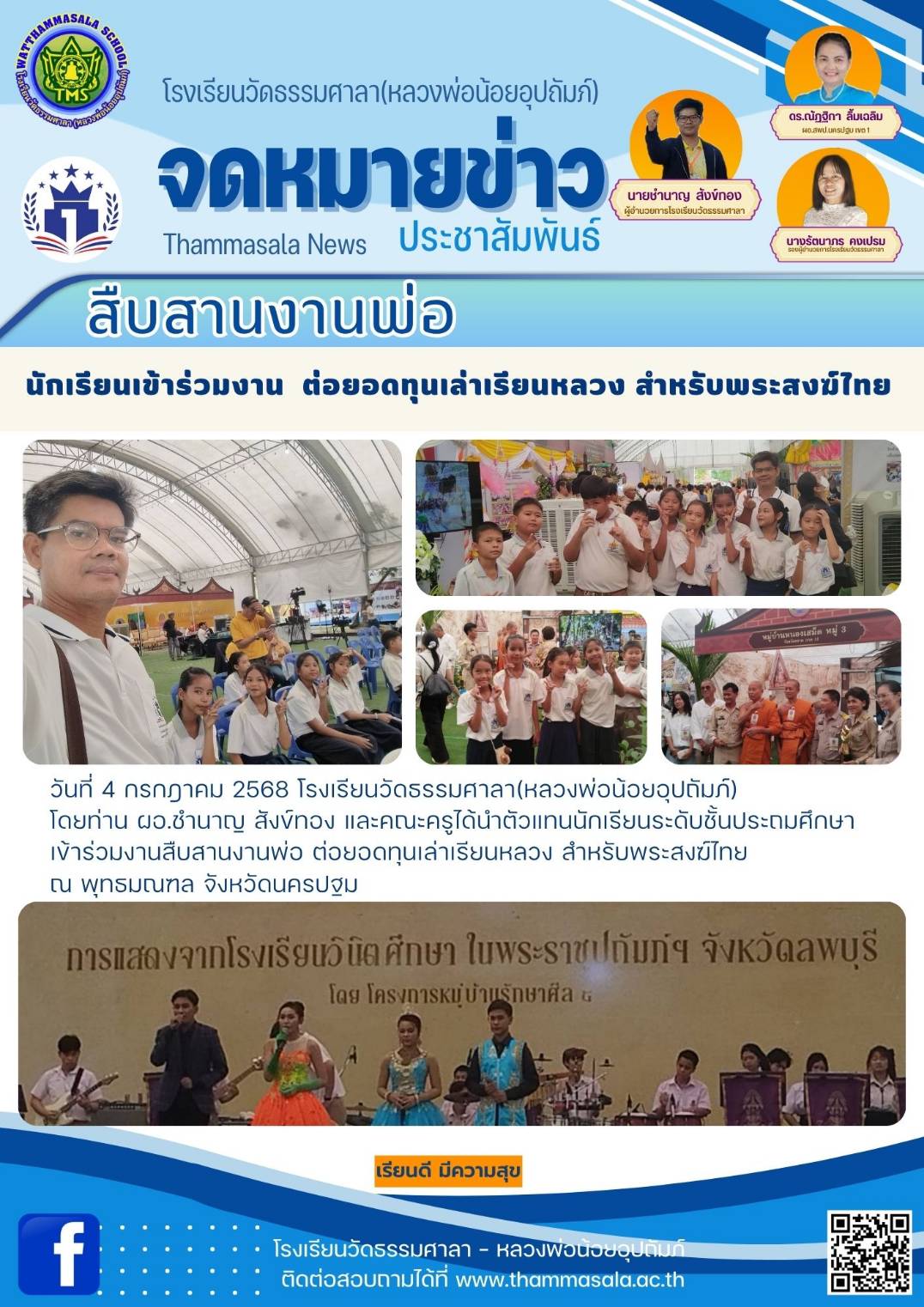 จดหมายข่าว ประชาสัมพันธ์ วันที่ 4 กรกฎาคม 2568 โรงเรียนวัดธรรมศาลา(หลวงพ่อน้อยอุปถัมภ์) โดยท่าน ผอ.ชำนาญ สังข์ทอง และคณะครูได้นำตัวแทนนักเรียนระดับชั้นประถมศึกษา เข้าร่วมงานสืบสานงานพ่อ ณ พุทธมณฑล จัง