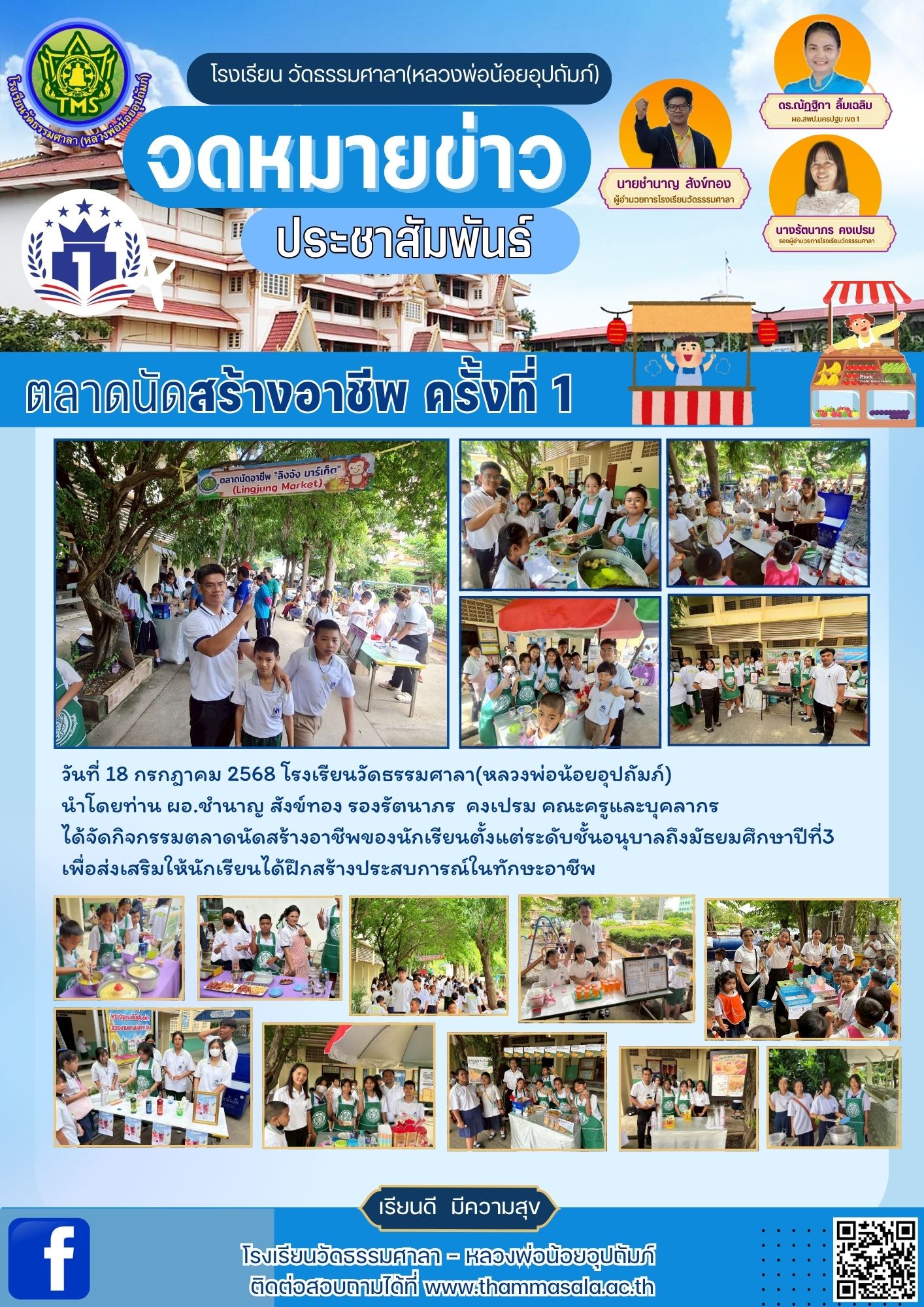 วันที่ 18 กรกฎาคม 2568 โรงเรียนวัดธรรศาลา(หลวงพ่อน้อยอุปถัมภ์) นำโดยท่าน ผอ.ชำนาญ สังข์ทอง รองรัตนาภร คงเปรม คณะครูและบุคลากร ได้จัดกิจกรรมตลาดนัดสร้างอาชีพของนักเรียน