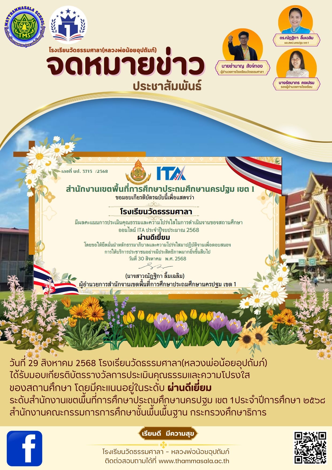 วันที่ 29 สิงหาคม 2568 โรงเรียนวัดธรรมศาลา(หลวงพ่อน้อยอุปถัมภ์) ได้รับมอบเกียรติบัตรรางวัลการประเมินคุณธรรมและความโปรงใส ของสถานศึกษา โดยมีคะแนนอยู่ในระดับ ผ่านดีเยี่ยม
