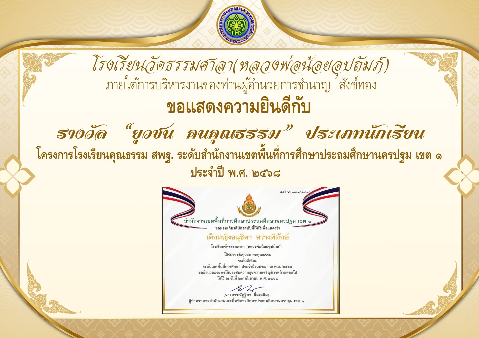 วันที่ 29 กันยายน 2568 นักเรียนโรงเรียนวัดธรรมศาลา(หลวงพ่อน้อยอุปถัมภ์) ได้รับรางวัล ?ยุวชน คนคุณธรรม? ประเภทนักเรียน โครงการโรงเรียนคุณธรรม สพฐ. ระดับสำนักงานเขตพื้นที่การศึกษาประถมศึกษานครปฐม เขต ๑