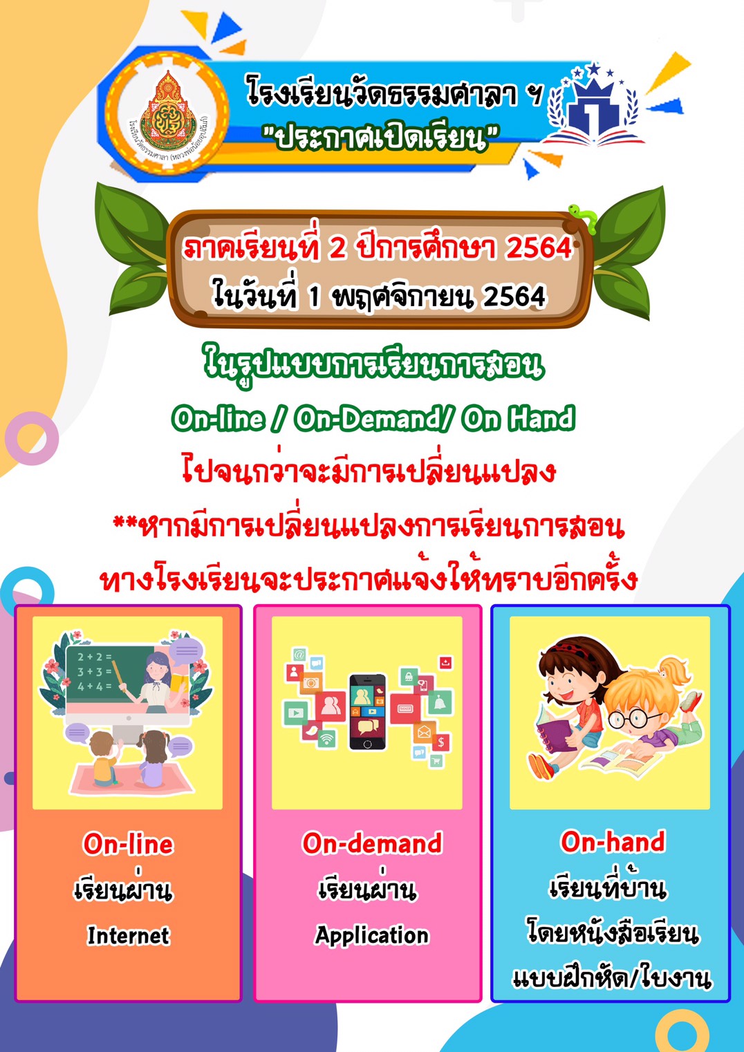 ประกาศ โรงเรียนวัดธรรมศาลา(หลวงพ่อน้อยอุปถัมภ์) เรื่องการเปิดเรียนปีการศึกษา 2564 ภาคเรียนที่ 2 ตั้งแต่วันที่ 1 พฤศจิกายน 2564 ในรูปแบบ On-line/ On-Demand/ On Hand ไปจนกว่าจะมีการเปลี่ยนแปลง