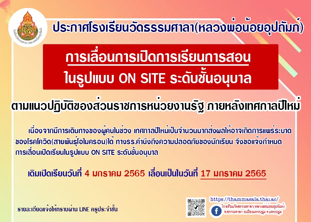 ประกาศ โรงเรียนวัดธรรมศาลา(หลวงพ่อน้อยอุปถัมภ์) เรื่อง การเลื่อนการเปิดการเรียนการสอน ในรูปแบบ Onsite (ที่โรงเรียน ระดับชั้นอนุบาล) เดิมแจ้งเปิดเรียน 4 มกราคม 2565 เลื่อนไปเป็นวันที่ 17 มกราคม 2565