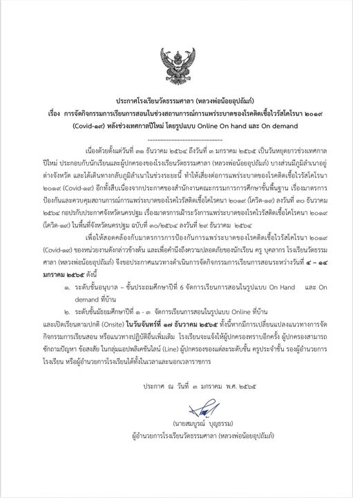 ประกาศ โรงเรียนวัดธรรมศาลา(หลวงพ่อน้อยอุปถัมภ์)เรื่อง การจัดกิจกรรมการเรียนการสอนในช่วงสถานการณ์การแพร่ระบาดของโรคติดเขื้อไวรัส Covid 19 หลังช่วงเทศกาลปีใหม่ โดยรูปแบบ Online On hand และ On demand