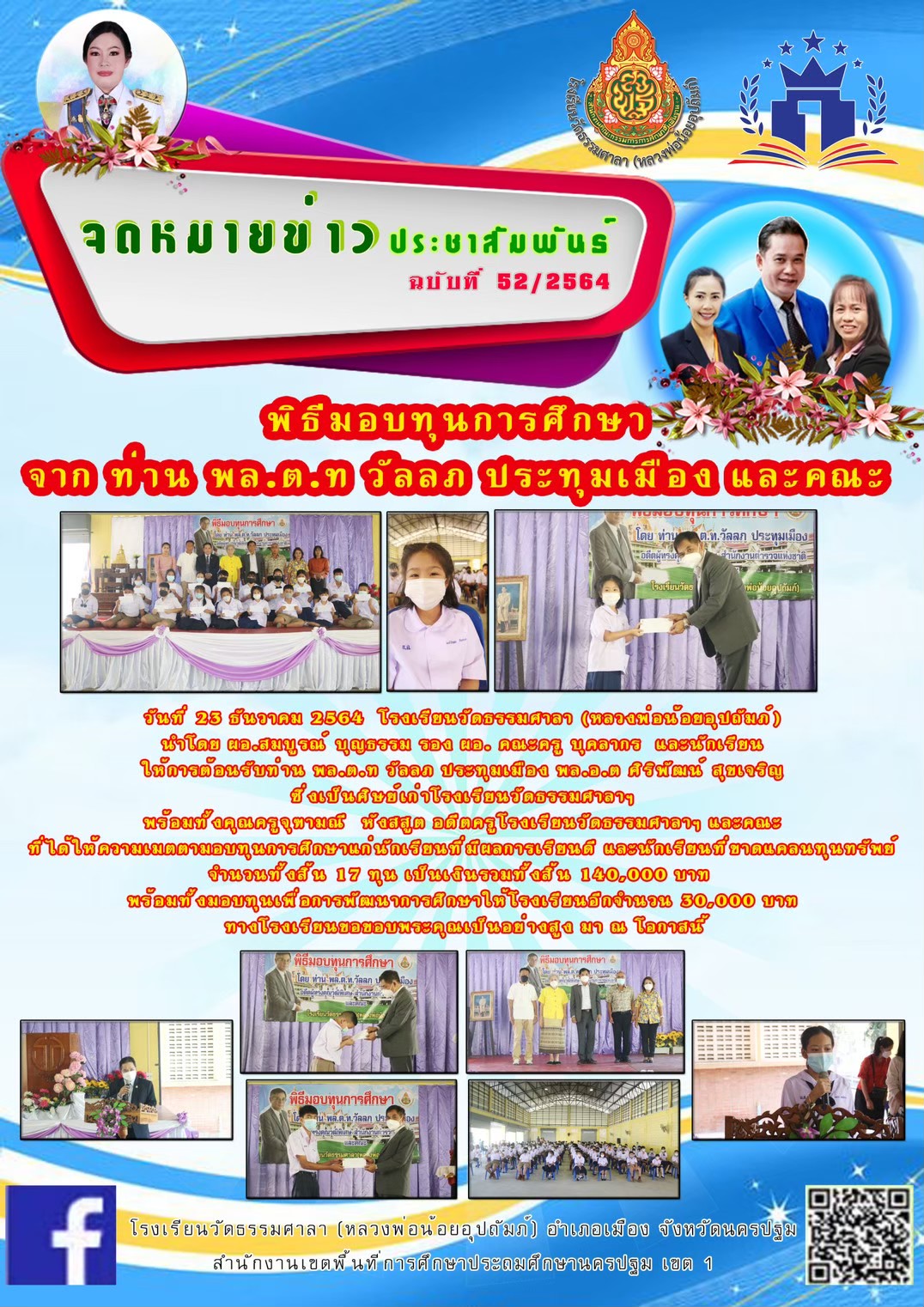 จดหมายข่าว ประชาสัมพันธ์ เมื่อวันที่ 23 ธันวาคม 2564 โรงเรียนวัดธรรมศาลา(หลวงพ่อน้อยอุปถัมภ์) ได้รับความอนุเคราะห์จากท่าน พล.ต.ท.วัลลภ ประทุมเมือง และคณะ มอบทุนการศึกษาให้กับเด็กนักเรียนที่เรียนดีและ