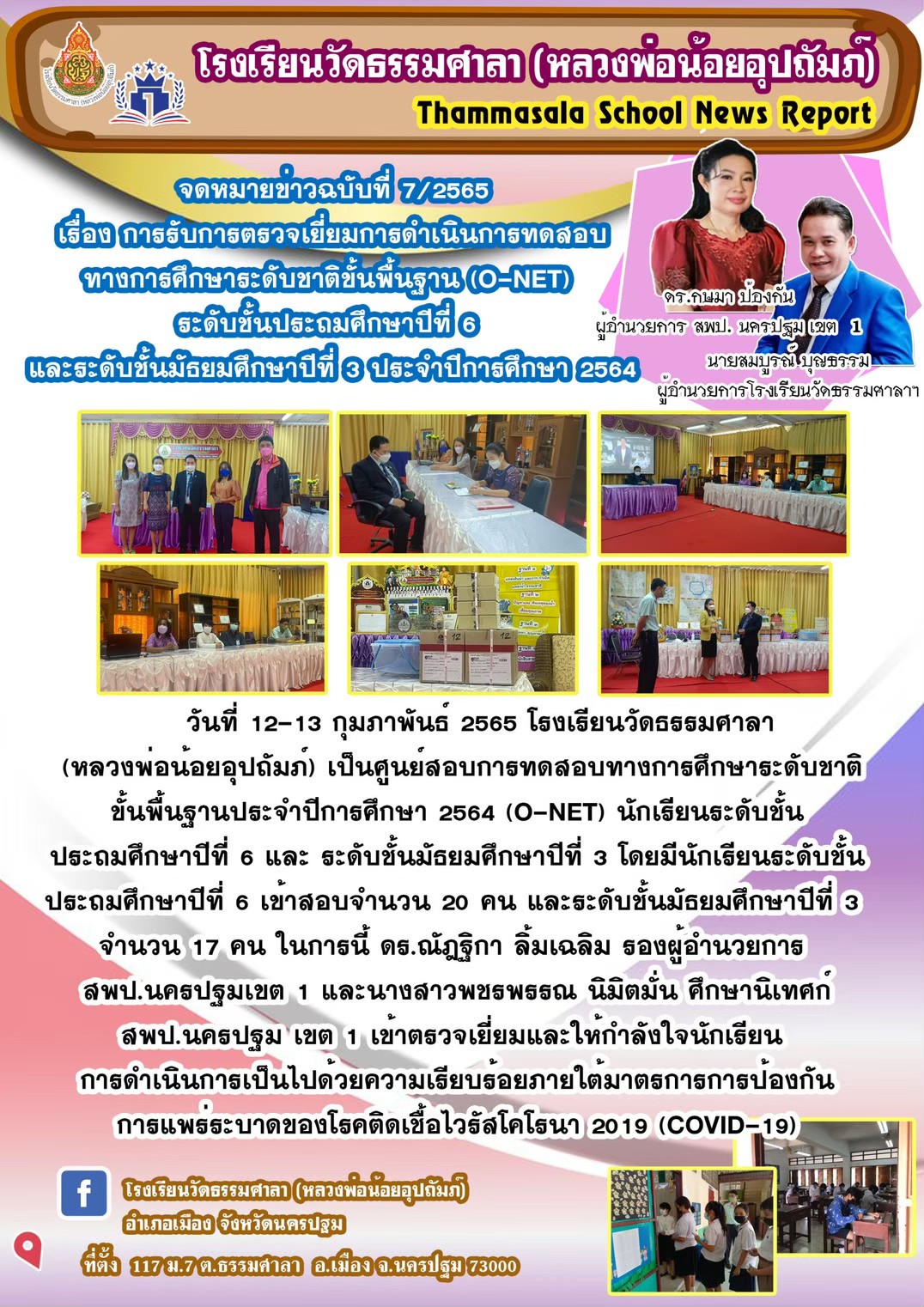 จดหมายข่าว โรงเรียนวัดธรรมศาลา(หลวงพ่อน้อยอุปถัมภ์)เรื่องการรับตรวจเยี่ยมการดำเนินการทดสอบทางการศึกษาระดับชาติขั้นพื้นฐาน (O-NET)ระดับชั้น ป.6 และ ม.3 ประจำปีการศึกษา 2564